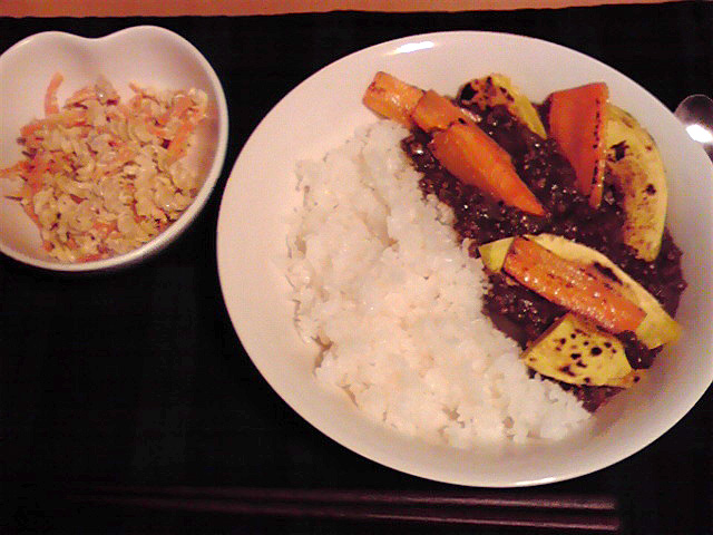 夕食は焼き野菜カレー。挽肉と玉ねぎのカレーに、かるく茹でたニンジンとカボチャをあとのせしてます。スパイシーなキーマカレーにニンジンとカボチャの甘みがいい感じ