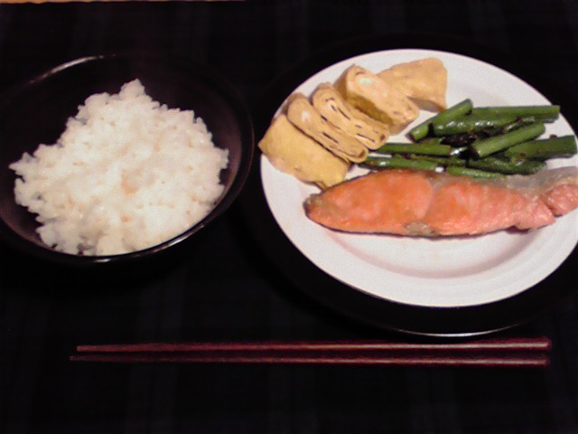 今日は鮭のムニエルに挑戦。思えば初めての魚料理だ! 貰い物のアスパラを添えました。あと弁当用なので卵焼きに再チャレンジ! 今回はフライパンにちゃんと半分ずつ溶き卵を入れたので、綺麗に焼けましたが、弱火で焼いてしまったからか、ちょっとふんわり度が足りなかったです。