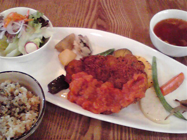 かと思ったら雨があがって曇りだったので意外にラッキーな気分…今日は、ecomo内のオーガニックレストランproufにて、シェフにおまかせランチ¥1,780を食べました。今日のメニューは国産豚肉を使用した豚カツはトマトソースとも合っていて、すごくおいしかったです。その他にも付け合わせの野菜類は素材の味を活かして、ほぼそのままのかたちで出てきており、野菜そのもののおいしさを楽しむことができました。たくさんの野菜をおいしく食べられたのでまた足を運んでみたいです。