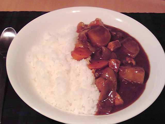 カレー粉はジャワとバーモント半々がベストですが、2片ずつ入れたところで、ちょっと足りない気がしたのでバーモントを1片追加。結果的には、ガラムマサラを入れたわりに甘めになったのは、玉ねぎの甘みなのかなぁ。もっと辛くていいかもと思いましたが、今回は大きめに切った野菜と角切りの肉、ホールのマッシュルームすべてが存在感がありました。