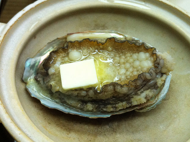 宿に着きひとっ風呂浴びた後には夕食。アワビ付きプランが目玉です! GW価格なのか値段の割に部屋も食事も普通でしたが、アワビは美味かった〜