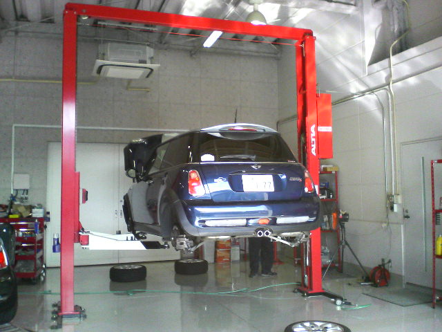 というわけで、点検前にダストが気になるブレーキパッドを交換しに、ひさびさEX.FORMまで行ってきました。今日は見るだけ…と思っていたのに、都合良く作業できるらしいので、おすすめの「GLADブレーキパッドスタンダード」を装着。ノーマルに近いタッチでダスト激減との事。オレンジはあまり好きではありませんが、あまり見えないだろうと安さに負けました。在庫品に限り工賃込みで¥40,000というのも即決の要因です。リフトアップは稀なので、車体裏を覗き込みましたが意外にキレイだったので安心しました。(写真中)