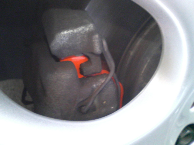 装着後の写真はこちら。(写真下) 思ったよりオレンジ見えますね。ノーマルパッドは2年13,000kmで3mmの減りでした。これなら次回交換は4年後で済みそうだ。さぁ、点検でホイール磨いてもらおうっと!
