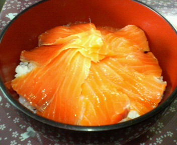 今朝は早起きしたので親の買出しに金魚の糞。「おごるから寿司屋に行こう」と提案したのに「スーパーのでいいよ」と却下。スーパーの寿司は食い飽きたのでサーモン丼にしました!(写真右)