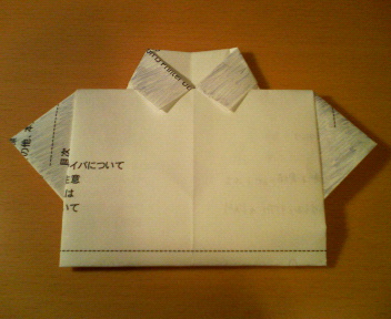 さらに話は広がり、折り紙の話へ。なつかしい「シャツ」を折ろうかと、勤務中にも拘らず挑戦したが悪戦苦闘。結局納得のいく形にならなかったので悔しくて、帰ってくるなり挑戦しました。せっかく写真とるなら裏紙やめれば良かった…。色鉛筆で着色したりして。う〜む暇人