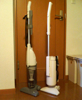 購入から2年半、かなり前から電源コードの接触がおかしく、だましだまし使用していた無印のサイクロンクリーナー(Ver.2005 右)がコードをいじってもほとんど作動しないので、無印へ行ってサイクロンクリーナー(Ver.2007 左)を買ってきました。前に見た時は¥4,500だったのに、価格改定で前のと同じ¥3,900になっていました。ラッキー