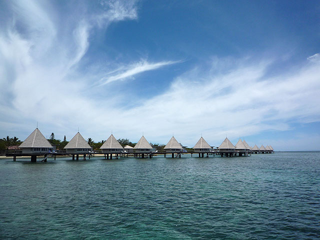 メトル島に近づき水上コテージが見えてきた。自然とテンションが上がるのだが、よく考えたらこれは予約してない。水上じゃなくても海岸が目の前でプライベートビーチみたいなもんなのでまぁいっか