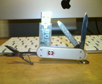 それから、64MBのを約4年使っていて容量に不満はなかったのですが、これを期にUSBメモリも購入。普通のは4GBで1万円を切るのに、VICTORINOXのSWISSMEMORYは1GBで1万円を超える。さんざん迷って、プラス¥1,050でツールもついてる方を買っちゃいました。まぁ、刃渡り3cm程なので、普段からぶら下げてても銃刀法違反にはならないでしょう(笑)
