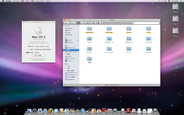 えーと、Leopardの感想ですが、まだ細部までさわってませんが、せっかく設定したMailのHTTPプラグインが無効になり、またHotmailが読めなくなり最悪。やっぱ始めはアプリが対応してなくて不便なんだろうなぁ。あと、フォルダのアイコンがTigerの方が良かったような…。