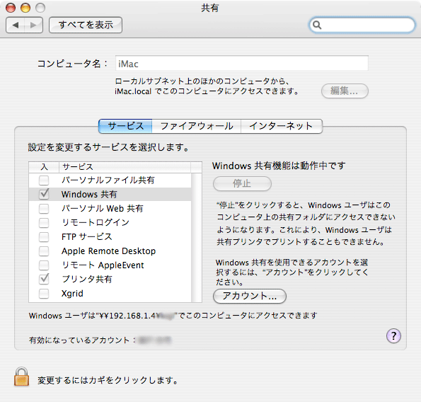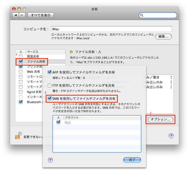 で原因は、Tigerでは環境設定の共有画面は「Windows共有」となっていたのに(写真左)、Leopardでは「ファイル共有」となっている(写真右1)。でオプションボタン(写真右2)をクリックして詳細をみると、写真右3ではオンになっているが、デフォルトではSMB共有がオフになっている。確かWindowsはSMB共有だったなと思ってチェック入れたら解決しました。あー、ほっとした。