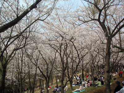 着いてみると意外に広く、そして桜の量がものすごい!人が多いのは予想通りでしたので、驚きはありませんでした。そして朝から場所取りをしてくれたさとちんさんにやっと出会う。越乃寒梅まで持ってきてくださって、至れり尽くせりです。これに買い出してきたさまざまな料理を加えてさっそく宴開始。風が少なかったので、安心して楽しめました。足りないと寂しいからと買いすぎた料理も結構食べ切れました。