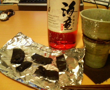 冷凍されているものをオーブン等で炙って食べます。あまりカリカリにならないように炙るのがコツです。食感はジャーキーというよりむしろ生ハムのような感じか? なかなかの珍味で酒のつまみに合います。今日のお供は鹿児島の芋焼酎「海堂」です。真っ赤なボトルに惹かれただけですが、なかなか美味しく、どんな飲み方でも合うそうです。どんな飲み方といっても当然「お湯割り」「水割り」「ロック」でしょうが、「寝酒」「ヤケ酒」「現実逃避酒」としてもイケてます