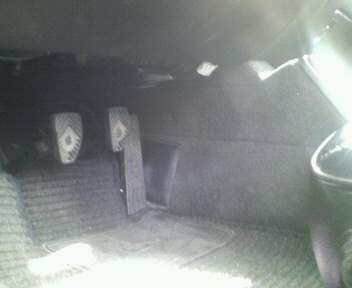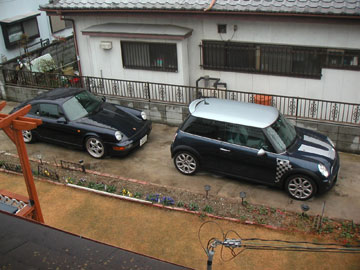 今日は雨なので、朝から正月のようにまったりして、小雨になったころ、欧州車試乗会、てゆうか全部ドイツ車。ここへ来るまでは、ポルシェ911カレラ2とMINIを3人で交代で運転して来ましたが、今日は結局、BMW530iツーリング、メルセデスベンツSLK230コンプレッサー(運転せず)、アウディA8まで乗りました。どれも初めての体験ですが、いちばん驚いたのはポルシェのペダル。ほとんどまっすぐ前方に踏み込む形(写真3)になっており、シートを前にして運転するとものすごく踏みにくい。左ハンドルのMT車は同オーナーのBMW Z3以来なのでかなり緊張しました。自分ではMINIのポテンシャルを発揮できませんが、車大好き上司に試乗してもらって「楽しい車」と評価されたのがうれしかったです。