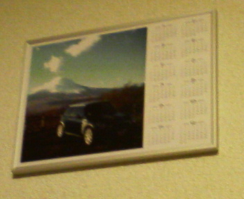 夕方、部屋の掃除を済ませ、壁にかけてある3枚の写真のうちひとつをこないだ撮って来たMINIの写真に変えようとしましたが、今年の壁掛けカレンダーがなかったので、カレンダー付きにしてみました。逆光だったのでどうしてもMINIがあまり見えなくなっちゃったのが残念。