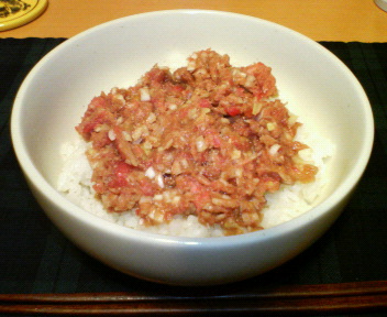 夕食は、正月にもらってきた鮪のすき身でつくるネギトロ丼(第4回)。あぁまたしばらく鮪ともお別れだなぁ…。