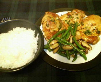 今日の夕食は「ガーリックペッパーチキンステーキ&いんげんとしいたけのバターソテー」。何かいきなりすごいことになってますが、前者はスーパーで買ってきたまんまです