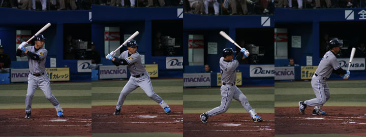 連写機能で撮った画像を並べてみると、週間ベースボールの打撃フォーム解剖なんとかみたいなのを思い出したので、並べてひとつの画像にしてみました(笑)