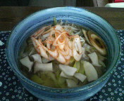 (;一_一) 冷蔵庫を物色すると干からびてしまったねぎが…。ということでうどんに決定。ねぎは一皮むいたら使えそうだったので安心。こないだダイソーで買ってきた和風れんげ(?)もデビューしました。