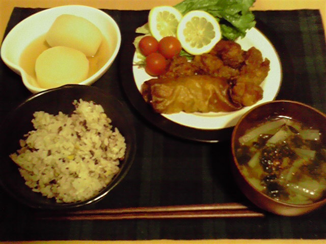 今日の夕食は、頂き物の唐揚げ&春巻き、さらに頂き物の大根を煮物と大根にしてみました。